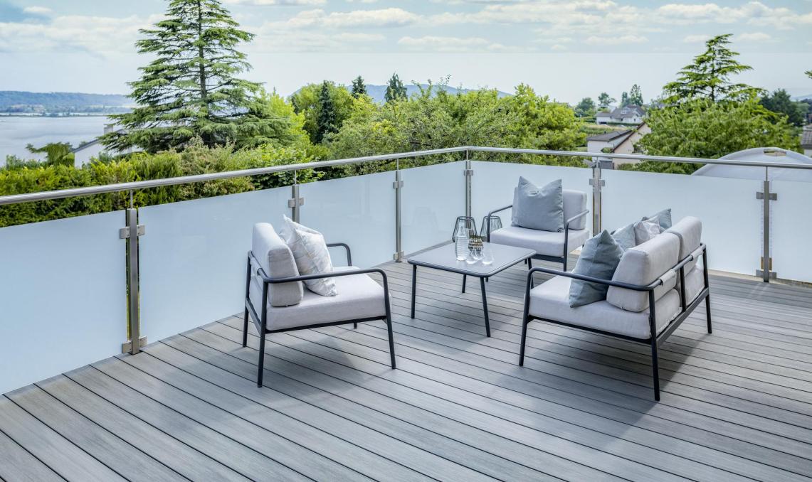 Questa realizzazione sulle rive del lago di Neuchâtel illustra perfettamente i numerosi vantaggi offerti dalle doghe per terrazza in composito Silvadec®.