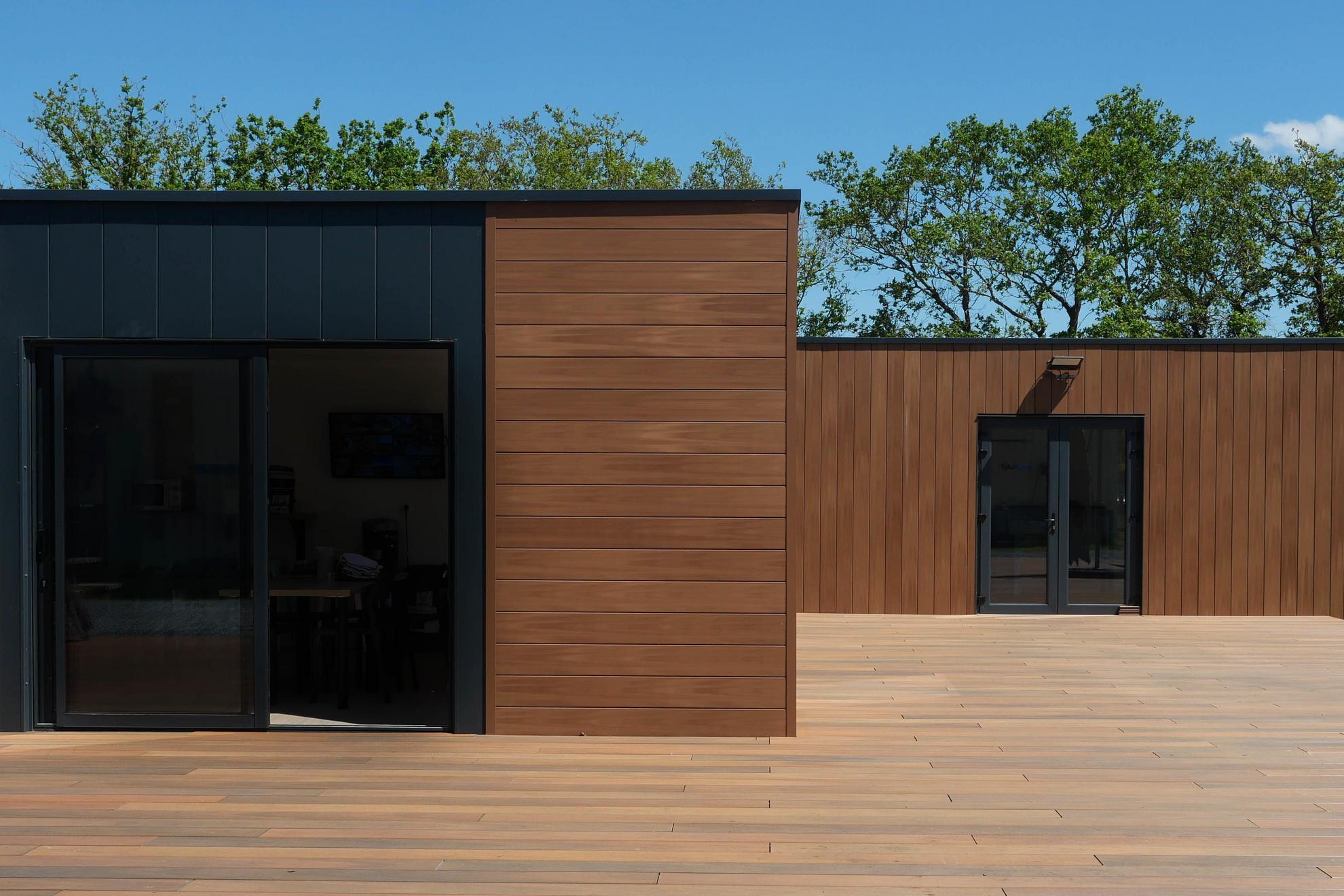 La tendenza è quella di associare il legno composito ad altri materiali come l’alluminio o il vetro per creare facciate miste con forte personalità. Il nostro rivestimento claire-voie si presta particolarmente bene a queste combinazioni, permettendo giochi di trasparenza e volumi.