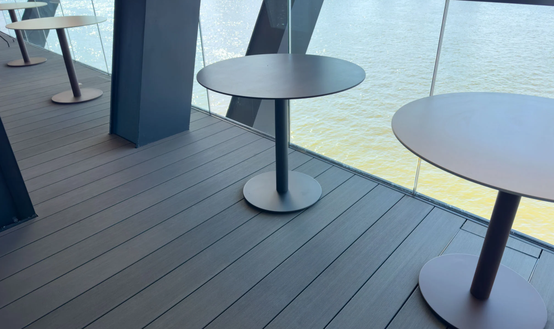 Au premier étage, sur le balcon de la Brasserie Constance, 100 m² de notre lame composite Silvadec Atmosphère coloris Cayenne ont été installés, apportant élégance et performance à cet espace de restauration haut de gamme.