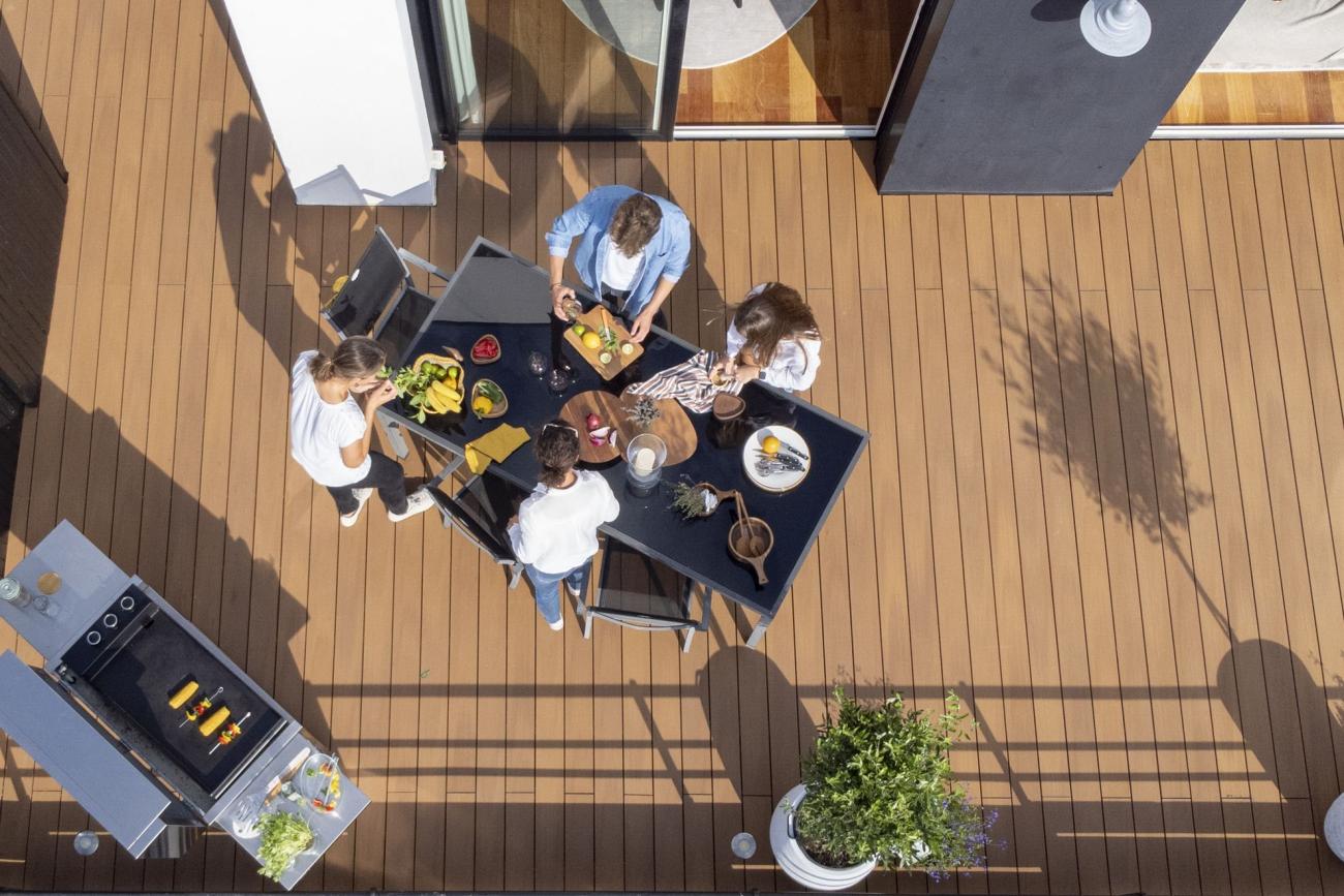 La nostra lama per pavimentazione in legno composito Atmosphere è realizzata con una tecnologia speciale che le conferisce caratteristiche eccezionali. La lama Atmosphere non subisce variazioni di colore, la tinta rimane assolutamente stabile nel corso del tempo! Inoltre, è molto facile da pulire, soprattutto quando di tratta di macchie domestiche. È una lama per pavimentazione piena (non alveolare) innovativa e resistente. È una tavola per pavimentazione adatta a tutti i tipi di terreno, ai progetti più esigenti e agli utilizzi più intensivi.